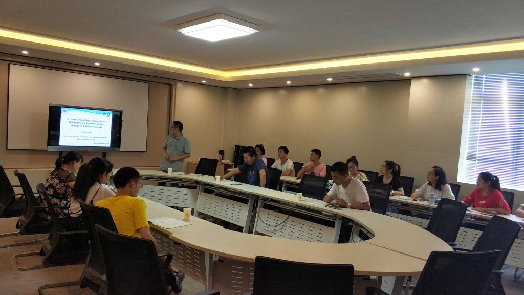廖金宝研究员以“一种通用的集合种群模型在大小河网结构中的应用”为主题,从弱势物种存在补偿作用的背景开始讲述,对集合种群模型进行了分析,并从长江流域、密西西比河流域以及湄公河流域等流域的模型应用结果进行汇报展示。讲座最后,廖金宝研究员还就当今流域生态学的研究热点、科研过程中数学理论知识的重要性,论文数据获取来源以及研究生教育等与参会老师、研究生进行了热烈的交流讨论。